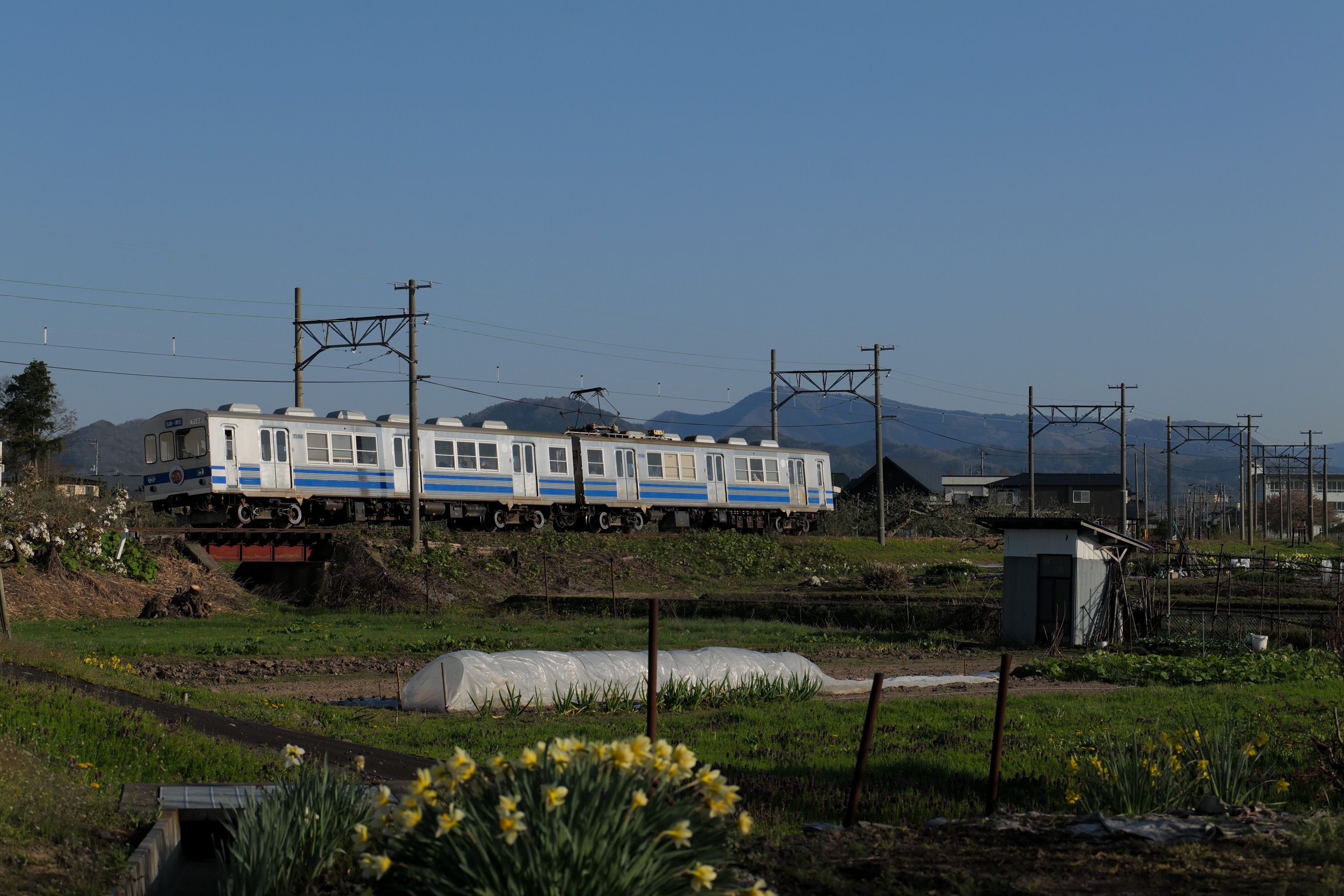 曇り空が続きそうだったので、ドン曇りになる前にリンゴ畑の写真を撮ってしまおうと一旦、石川駅北側に移動したのですが、晴れてきたので編成写真が撮れそうと目星をつけた鯖石駅の北側にやってきました。