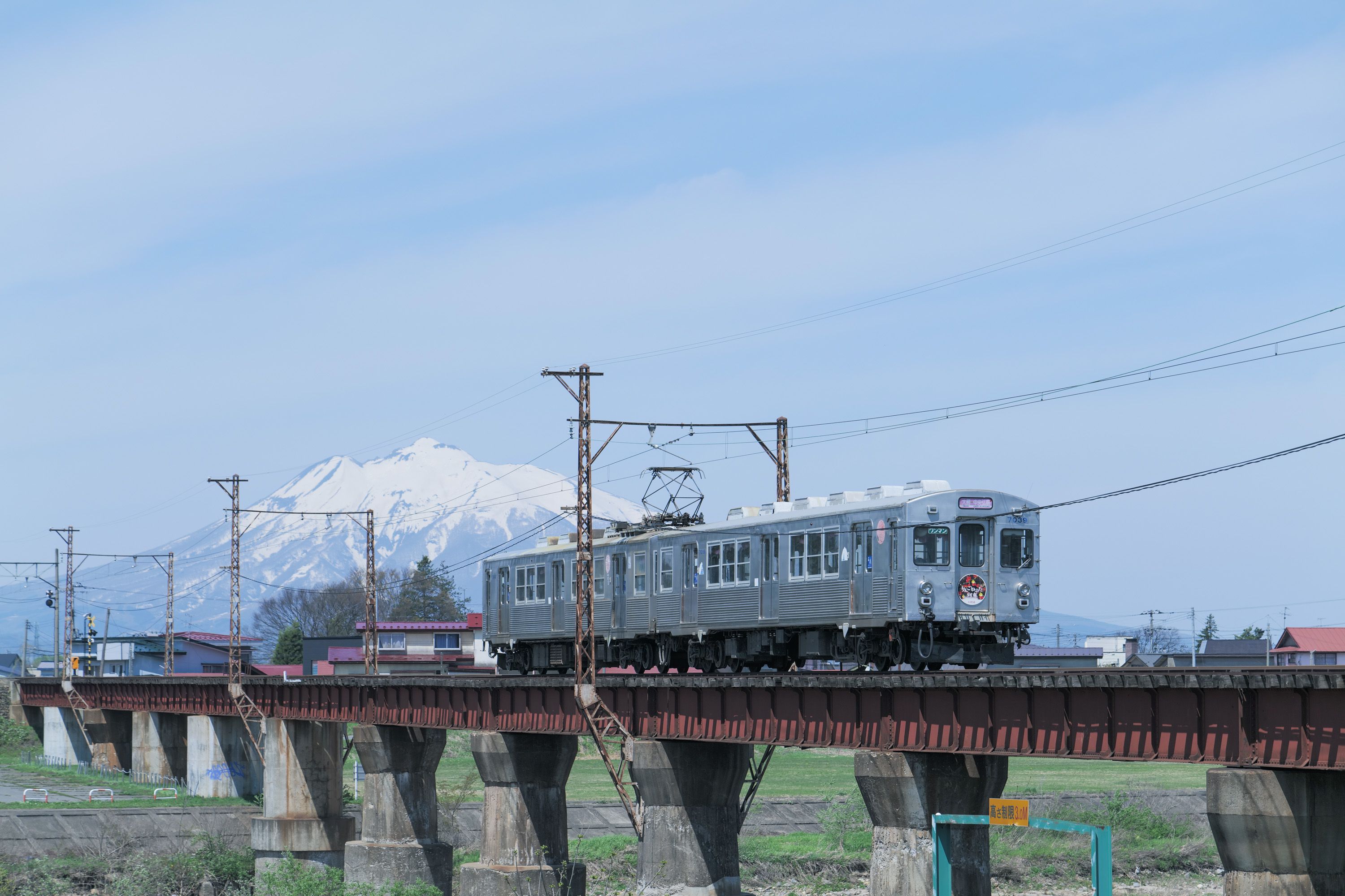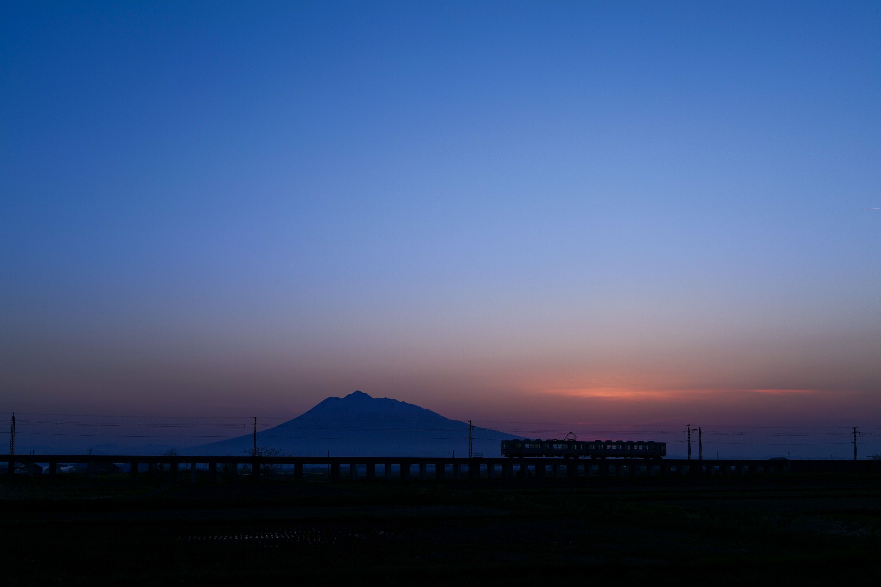 岩木山と高架区間を走る電車のシルエット、これも素晴らしい。