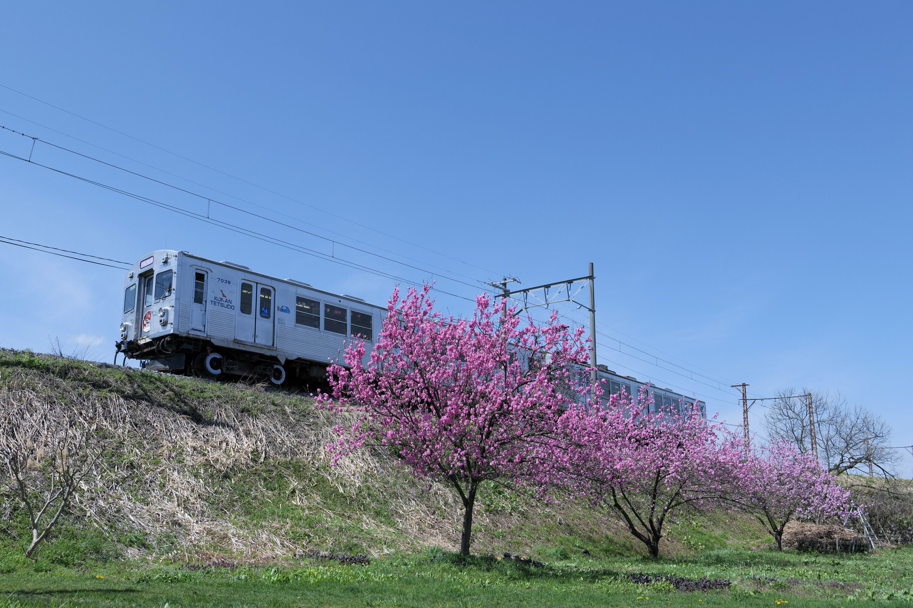 花は散ってしまった後で、葉も青々としているとは言えない感じですが、これくらいのほうが枝の間から列車がよく見えてよいかもしれないです。