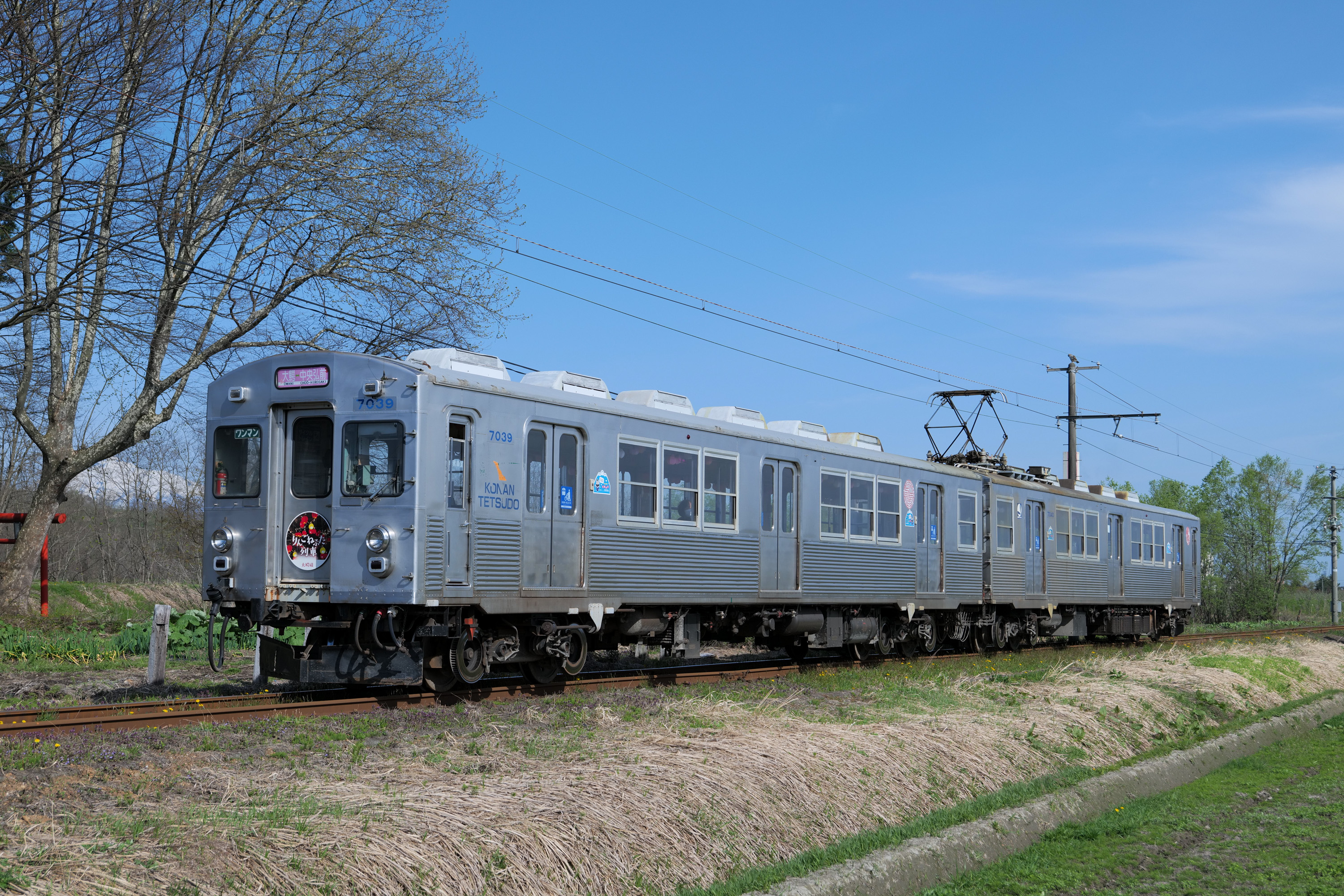 7037-7038編成は「りんご畑鉄道」ラッピングでカラフルな水玉模様なのですが、なぜか青森市の医療法人のHMです。